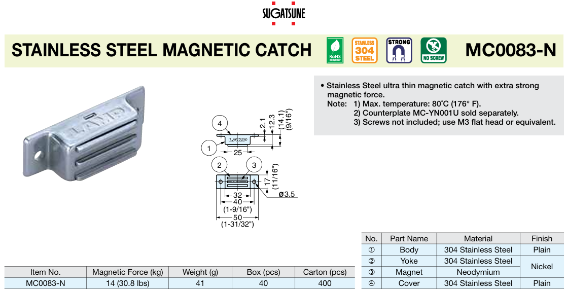 Sugatsune Stainless Steel ultra thin magnetic catch with (30.8 lbs force)