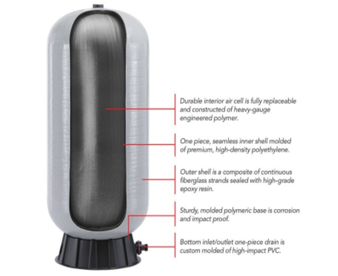 Durable interior air cell is fully replaceable and constructed of heavy-gauge engineered polymer. 2 One-piece seamless inner shell is molded of high-density polyethylene. 3 Outer shell is composed of continuous fiberglass strands sealed with high-grade epoxy resin. 4 Sturdy, molded polymeric base is corrosion- and impact-proof. 5A Quick connect, bottom inlet/outlet assembly is custom molded of high-impact engineered polymer. 5B Bottom inlet/outlet one-piece drain is custom molded of high-impact PVC.
